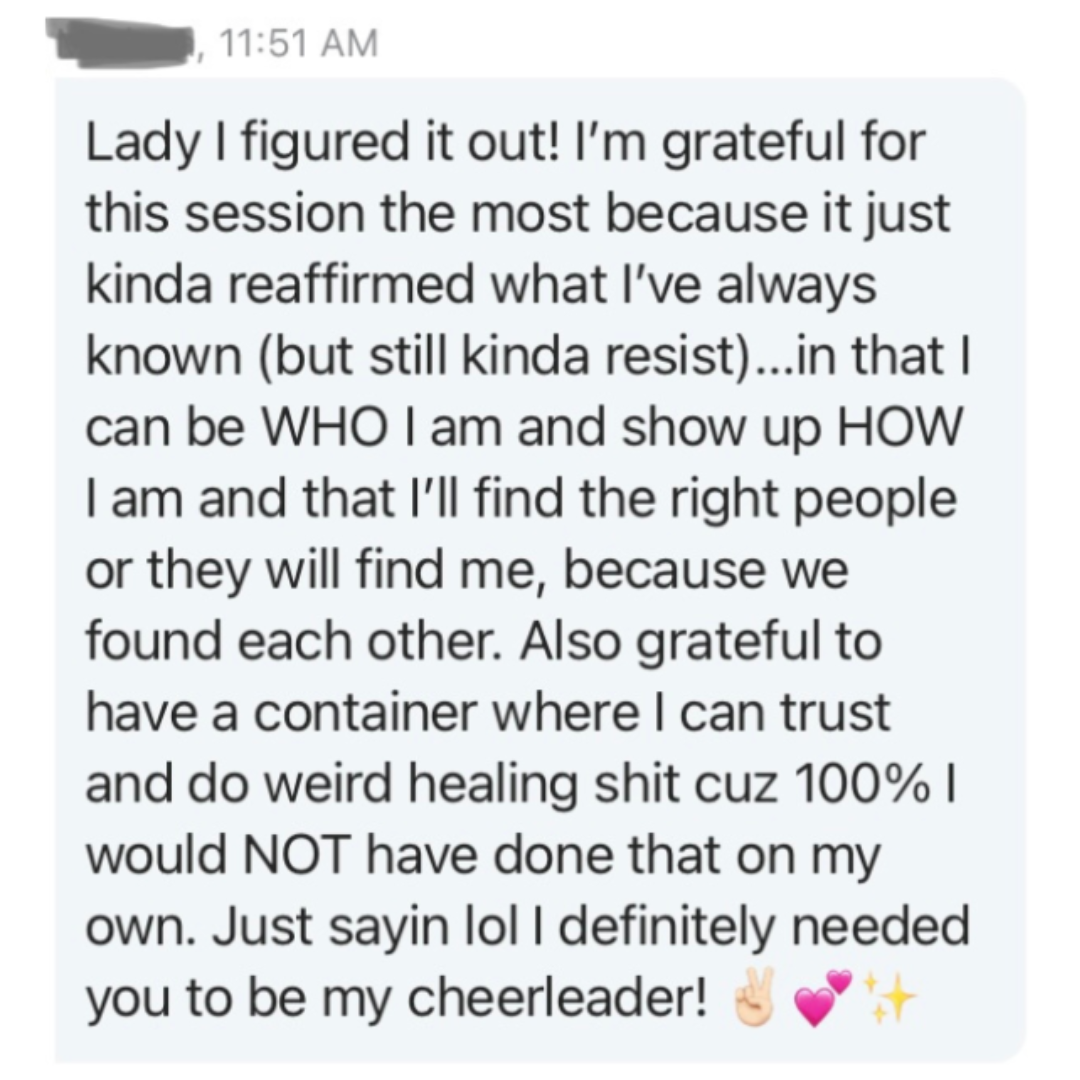 My approach to coaching weaves somatic, energetic, nervous system, trauma-informed, and spiritual tools to guide you back to clarity, self-trust, love, and grounded power.