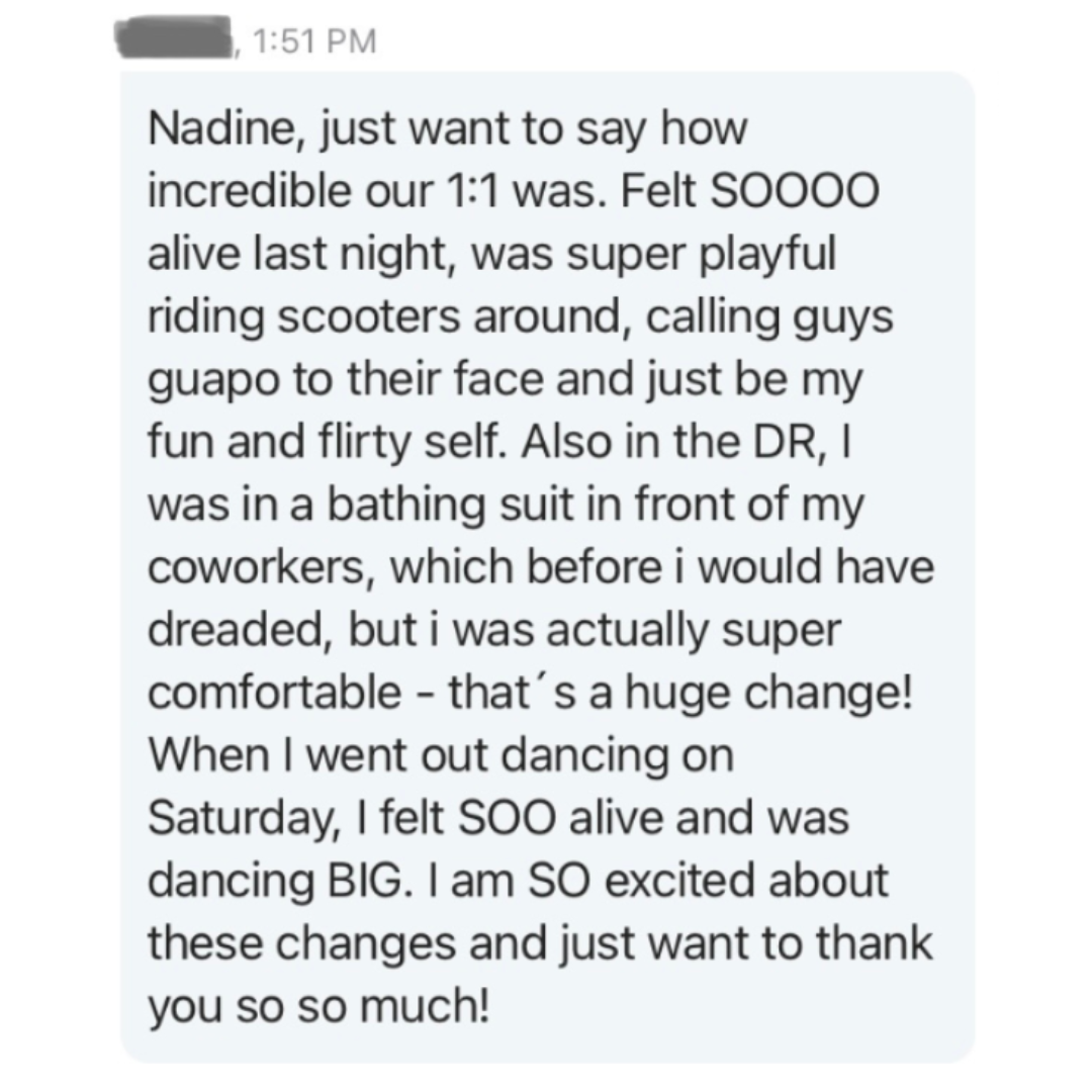 āWorking with Nadine has shifted who I am as an individual⦠how I show up in this world,Ā how I meet myself with compassion and acceptance, and embodiment of who I am without shame.ā